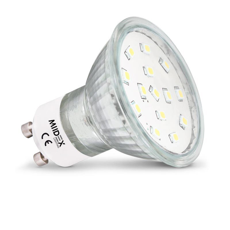 Ampoule Spot LED SMD Miidex Lighting - culot GU10 - Consommation 4 watts - jusqu'à 360 lumens - 220-240 volts AC - Aluminium + Verre + PC - IP40 - certification(s) CE / RoHs / EMC