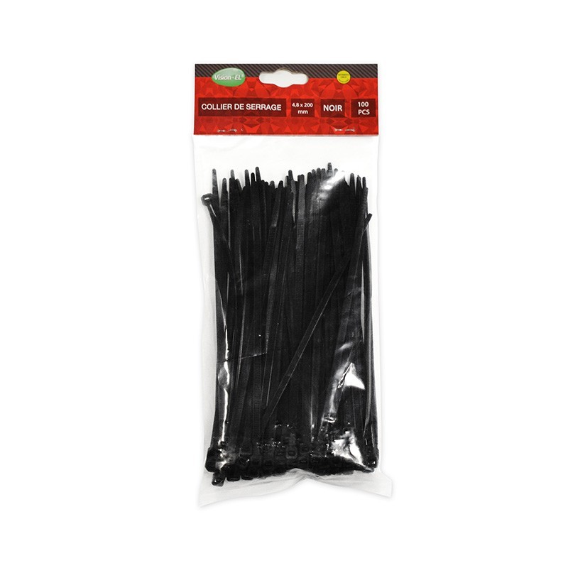 Collier de serrage en nylon - Sachet de 100pces - Longueur 200 mm - Disponible en largeurs 3.6mm et 4.8mm - Noir.