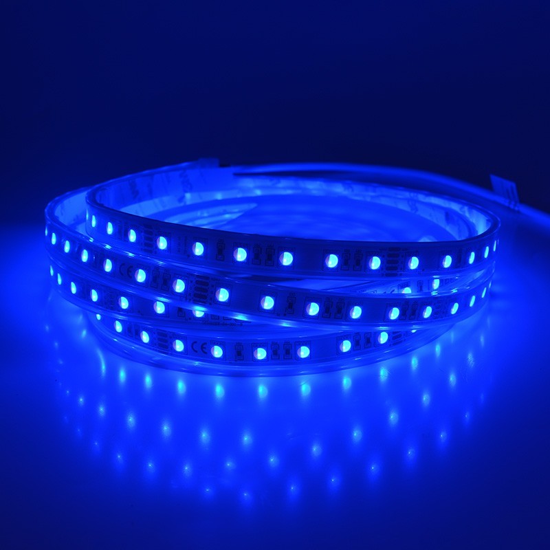 Ce ruban sait se distinguer des autres. Comment ? En ne proposant qu'une seule LED avec une multiplicité de couleurs ! Voisin de la référence VI751691, il propose exactement les mêmes caractéristiques techniques, à la différence près, qu'il est protégé d'une gaine en silicone le rendant IP67. C'est un avantage notable, surtout si vous souhaitez l'installer dans des lieux humides ou poussiéreux. Malgré tout, la gaine augmente quelque peu sa largeur et son épaisseur, le faisant passer respectivement à 14 et 4 mm. Il est par conséquent impossible de l'installer dans un rail en alu standard et c'est pour cela qu'il est fourni avec une bande adhésive 3M. Coté puissance d'éclairage, ce ruban projette 690 Lumens, ce qui équivaut à ~70Watts halogène. D'une longueur de 5 mètres, il reste sécable tous les 10 cm et dimmable avec un contrôleur adapté.