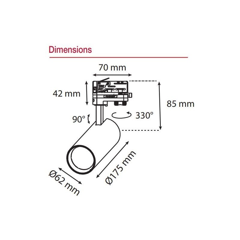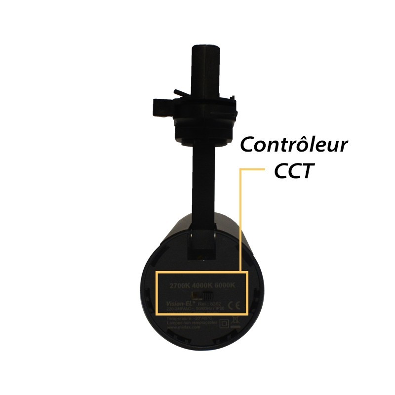 Spot Orientable CCT sur rail 15W LED IP20 Miidex Lighting - Compatible au standard XTS - Puissance de 15W équivalente à 140W halogène - 1200 à 1300 lumens selon la température de couleur - 3 températures au choix via contrôleur sur spot en Blanc Chaud (2700°K), Blanc Neutre (4000°K) et Blanc Froid (6000°K).