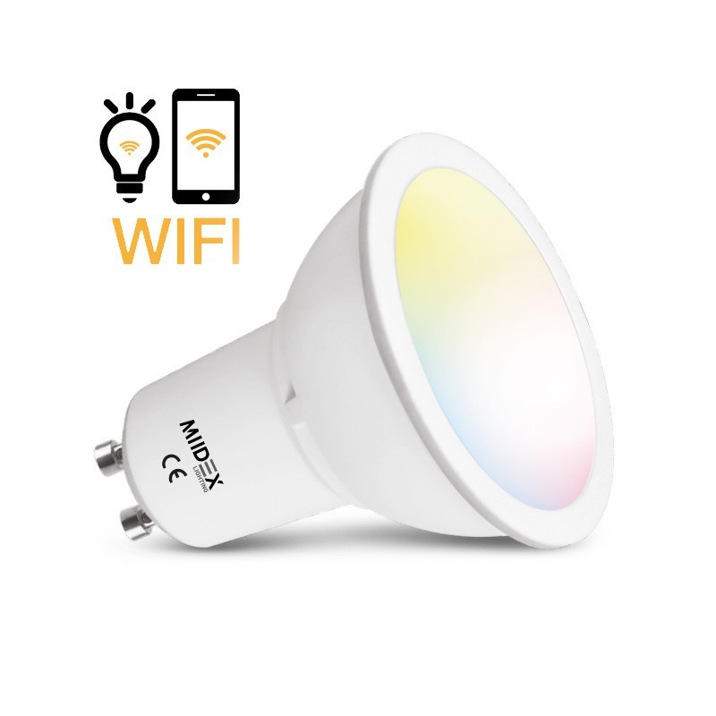 Ampoule LED GU10 5W connectée - CCT+RGB - Miidex Lighting - 230V - Puissance de 5W équivalente à 45W - Fonctionne avec l'application Smart Life - Compatible Google Assistant, Google Home, Amazon Alexa, Freebox Delta - Wifi 2,4 Ghz - Variateur intégré.