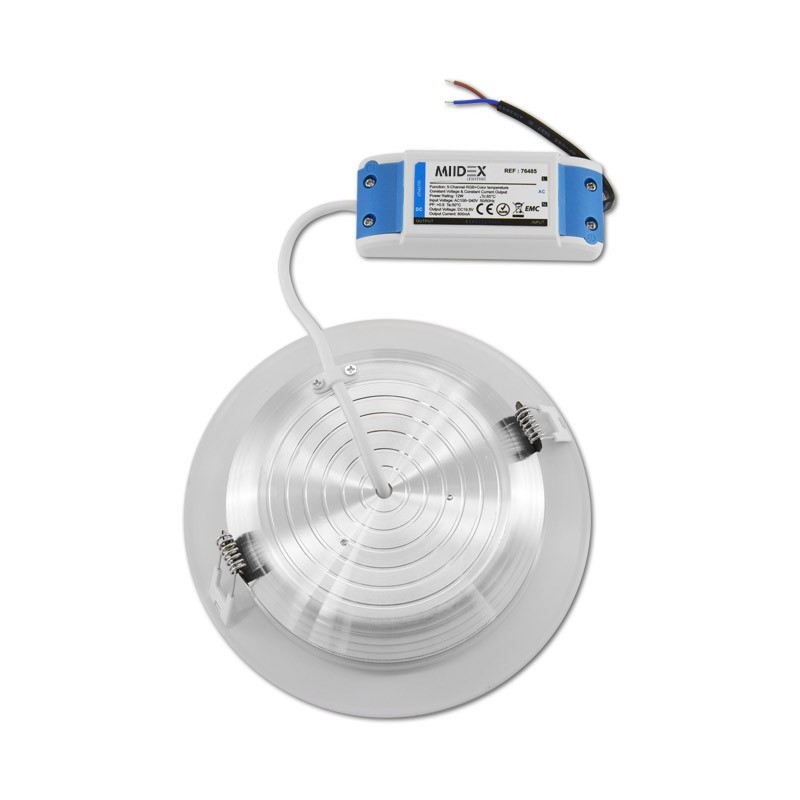 Downlight LED RGB+CCT Miidex Lighting - 12W - IP40 - Transformateur 230V/30V DC inclus - Puissance de 12W équivalente à 110W halogène - Variateur intégré - Fonctionnement avec la télécommande - Disponible en RGB+Blanc (2700K.à 6500K)