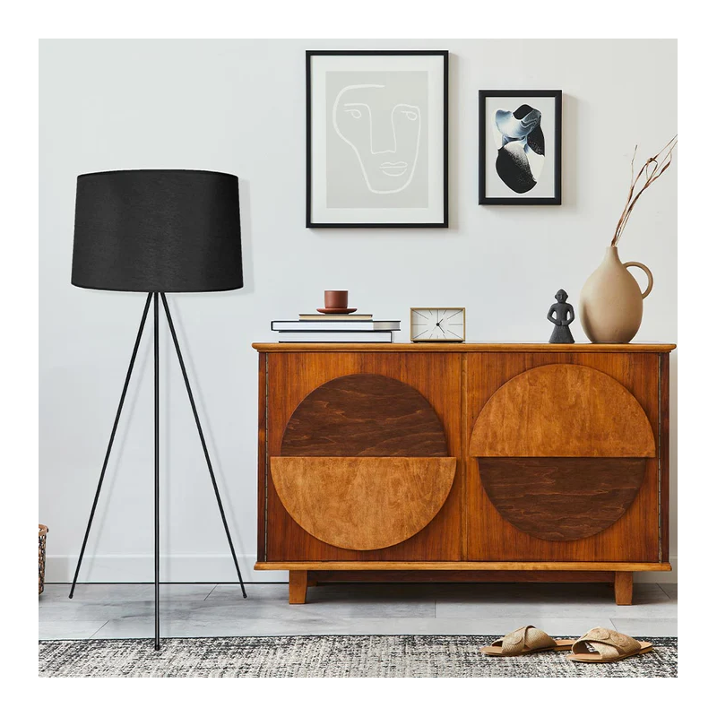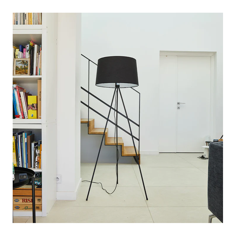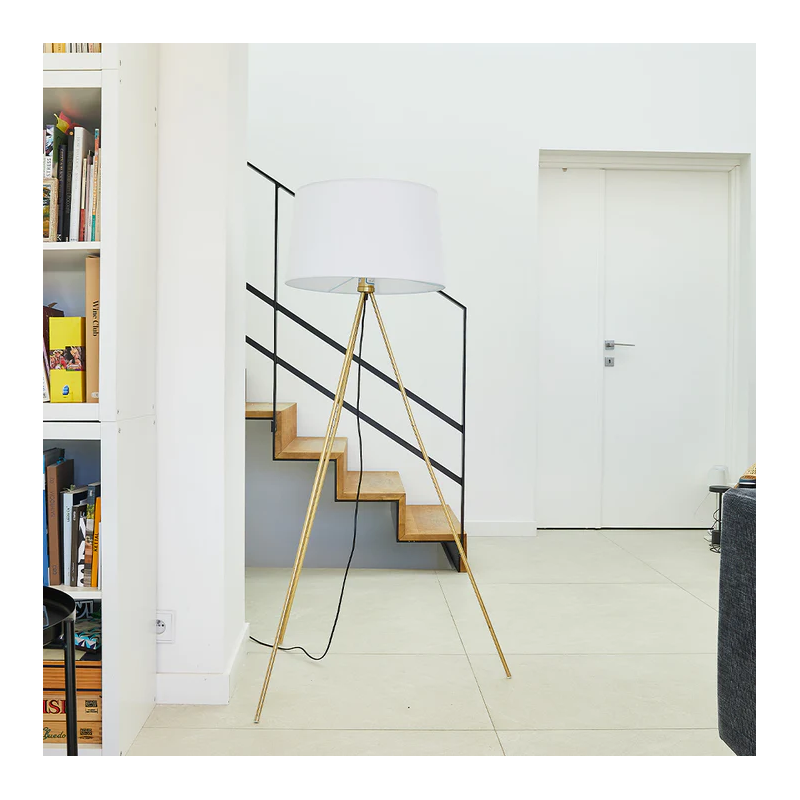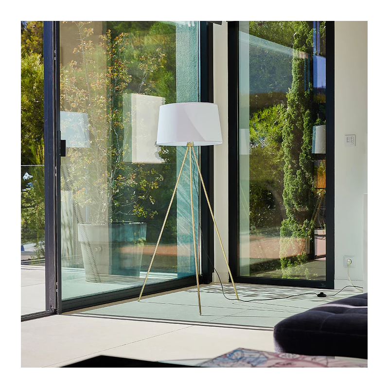 • LAMPADAIRE TRIPODE Utilisez le lampadaire ELLIA pour apporter de la lumière à votre intérieur. Avec sa forme simple, élégante et chic, sa structure trépied finition laiton ou noir, son bel abat-jour en tissu, son câble électrique d’une longueur de 3.2 mètres et sa douille pour ampoule E27, créez une ambiance qui vous ressemble.