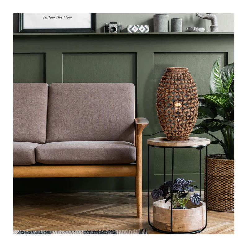 • DESIGN : Une fois installée et éclairée, les motifs que forme le tressage de la lampe de table ROSA en jacinthe aquatique viendront créer de jolies ombres portées dans votre intérieur.