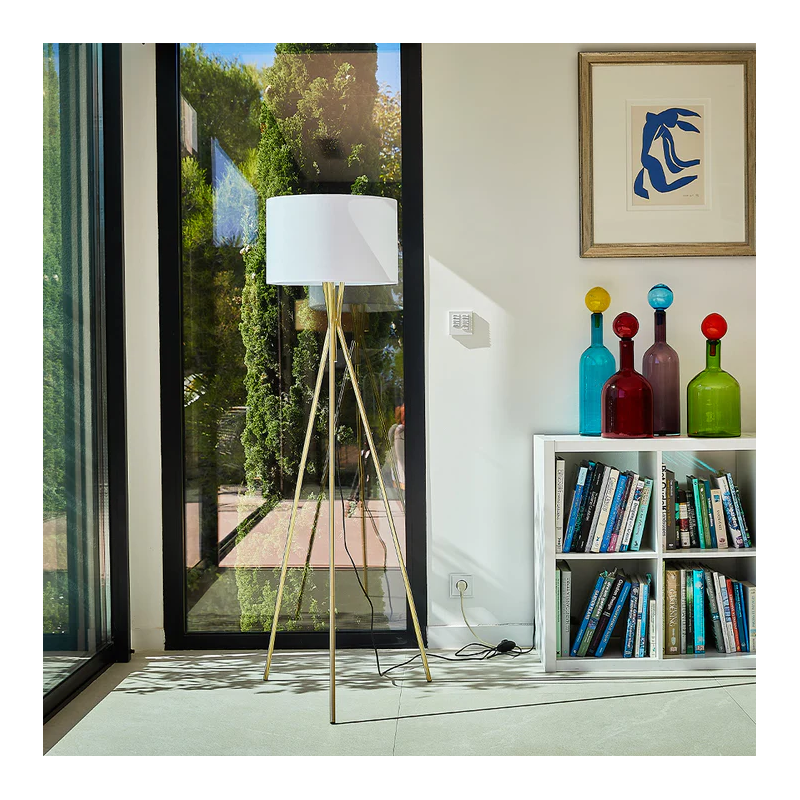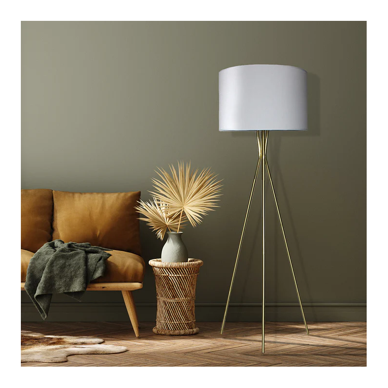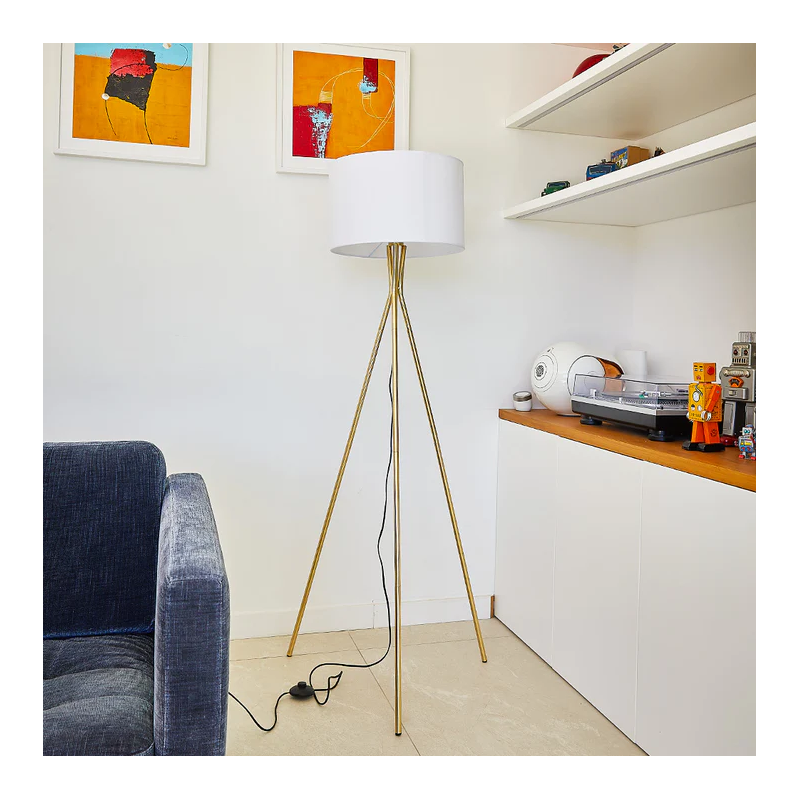 • LAMPADAIRE TRIPODE Utilisez le lampadaire NOELIE GOLD pour apporter de la lumière à votre intérieur. Avec sa forme simple, élégante et chic, sa structure trépied finition laiton, son bel abat-jour en tissu, son câble électrique d’une longueur de 3.2 mètres et sa douille pour ampoule E27, créez une ambiance qui vous ressemble.