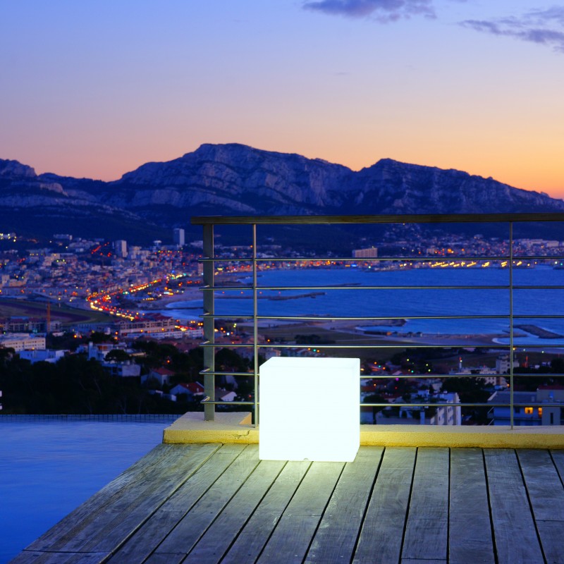 Cube Lumineux en polyéthylène rotomoulé (résistant aux chocs, aux UV et étanche (IP44). Finition haut de gamme, fabriqué en Europe. Simple d'utilisation et moderne, ce cube lumineux enchantera votre intérieur ou extérieur constituant ainsi un éclairage décoratif le jour, et d'ambiance la nuit.