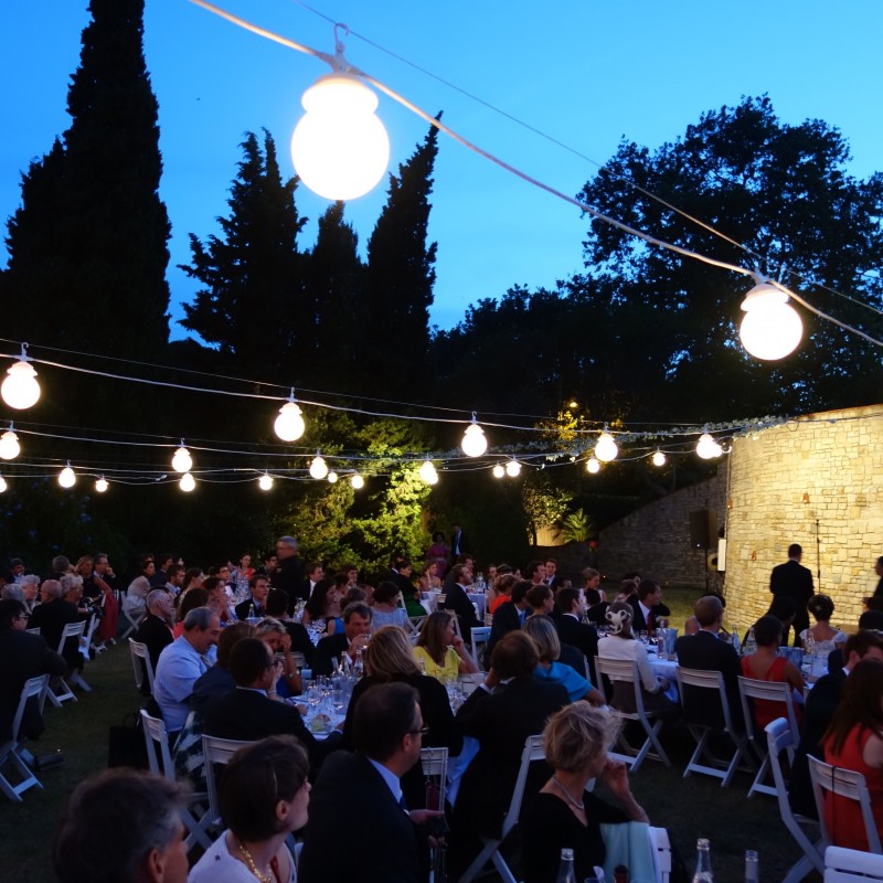 Guirlande professionnelle à culot E27 (gros culot à vis), avec protection des ampoules par globe ABS opaque pour une diffusion de la lumière optimale, douce et chaleureuse. Existe en version 4 globes (7,5 mètres) et 10 globes (16,5 mètres). Les ampoules LED E27 3W blanc chaud sont incluses. Vous avez toutefois la possibilité de les remplacer par d'autres ampoules LED plus ou moins puissantes, d'une autre température de couleur ou multicolores.