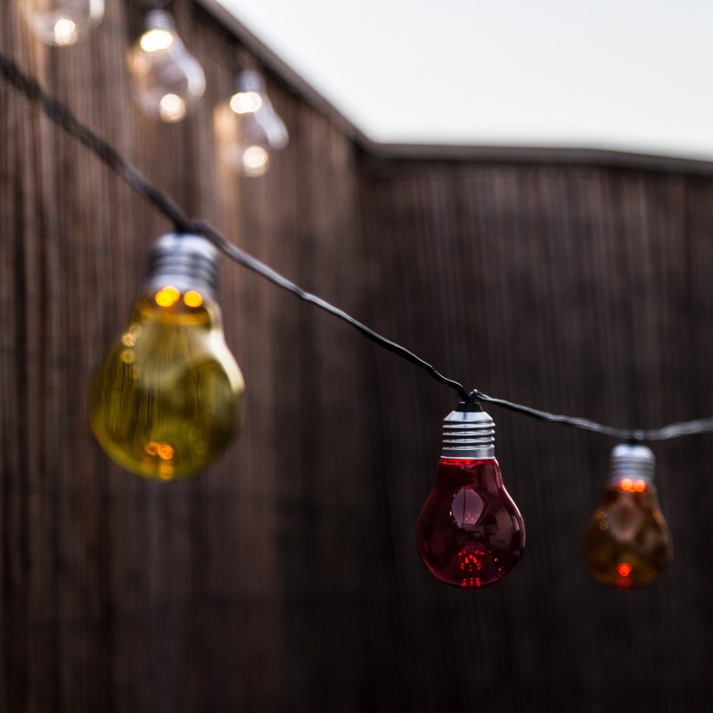 • ROBUSTE : ainsi, la guirlande lumineuse LED Fantasy C10 design d’une longueur totale de 7,50m composée de 10 ampoules transparentes multicolores est protégée contre les éclaboussures (IP44) et résiste aussi aux UV. Il y a 30cm entre chaque ampoule et 4,85m de la prise à la première ampoule.