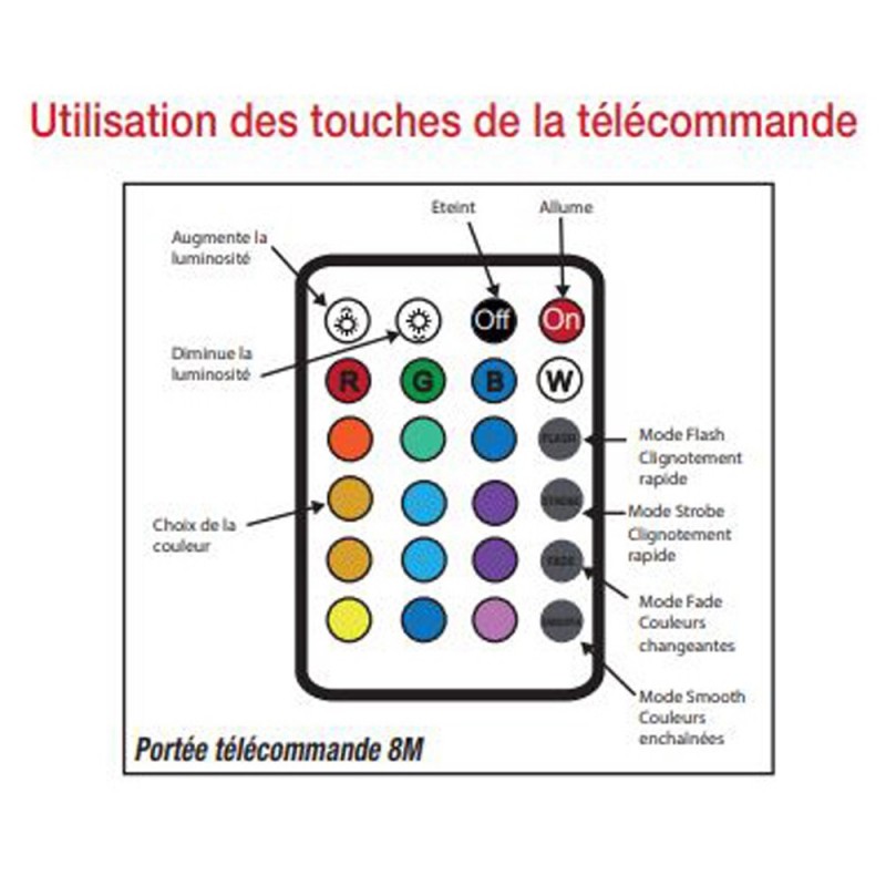 Ce projecteur LED est multicolore (RGB). Les couleurs et modes de défilement sont pilotables, au choix grâce à la télécommande Radio Fréquence incluse. Vous pourrez ainsi jouer avec toutes ces fonctionnalités : variation de la luminosité, choix entre un dizaine de couleurs, mode Flash, Strobe, Fade, Smooth... La portée de la télécommande est d'environ 8 mètres. Ce projecteur LED RGB propose une belle puissance tout en consommant très peu. Simple à installer, vous illuminerez avec originalité vos jardins, allées, terrasses... ou tout volume extérieur puisqu'en plus d'être solide, ce projecteur est étanche!